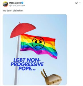 A tweet from a popular Pope-fan on X saying “We don’t claim” the “LGBT non-progressive Pope”. Source: @ClubConcrave via X.