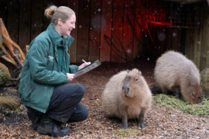 Gizmo and Kiwi the Capybaras are counted by keeper Holly Dorning as it snows during London Zoo’s Annual Stocktake 2026 in London. (AP Photo/Kirsty Wigglesworth)