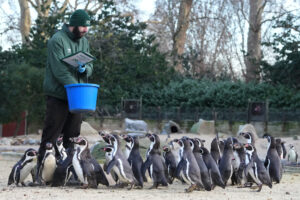 Keeper Jay Firtina feeds the Humboldt Penguins during London Zoo’s Annual Stocktake. (AP Photo/Kirsty Wigglesworth)