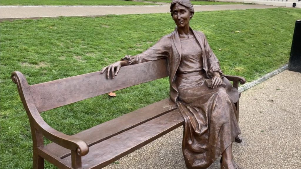 The life-sized bronze figure sits on a bench overlooking Richmond-upon-Thames. The celebrated author lived and wrote in Richmond with her husband from 1914 to 1924.