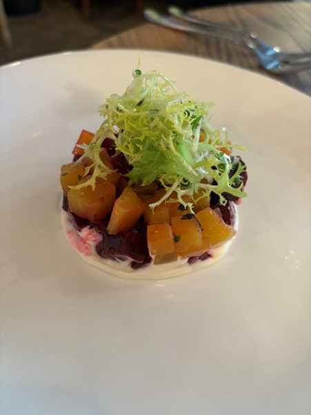 The meal consists of starters such as Beetroot served with fig leaves and wildflowers. The mains include a wide selection of meats, such as lamb belly with white onion and thyme.