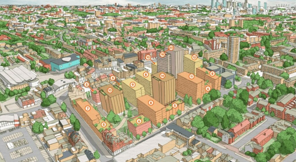 The proposal for the site would see 16 tall towers, comprising a total of 877 homes, built on the site of the shopping centre and market. There are no tall towers currently in Peckham.