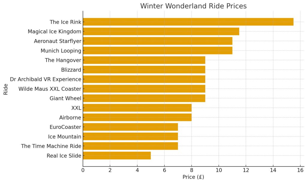 Ice Skating is one of the more expensive attractions; for £15.50, you’re granted admission to the UK’s largest open-air ice rink. Add that to a ride on the notorious five-loop rollercoaster – Oktoberfest’s Munich Looping – and costs increase by another £11.