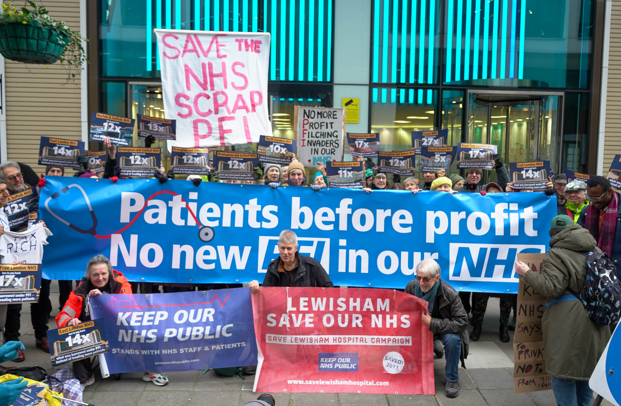 They addressed the crowd and criticised the return of private finance into the NHS, warning that it risks repeating the same long-term financial burdens PFI created in the 1990s and 2000s.