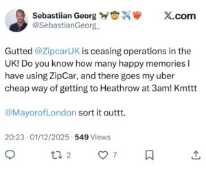 Londoners have taken to X to express their frustrations at Zipcar’s closure, calling on the Mayor to “sort it out”.