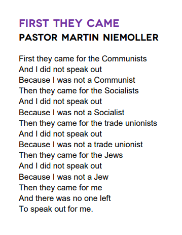 Source: First They Came by Pastor Martin Niemöller from the Holocaust Memorial Day website