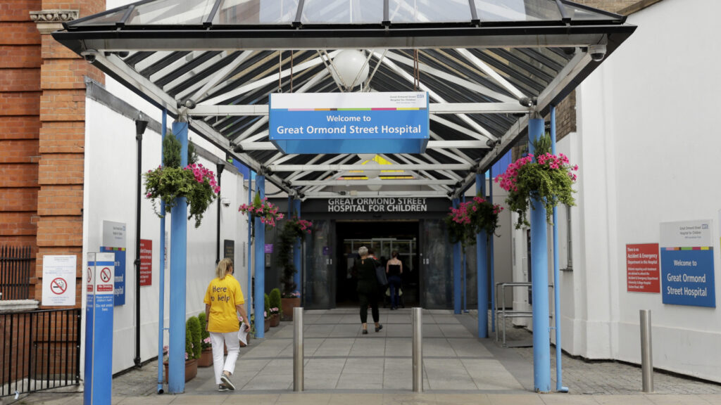 An exterior view shows the main entrance to Great Ormond Street Hospital in London, Tuesday, July 18, 2017. (AP Photo/Matt Dunham)