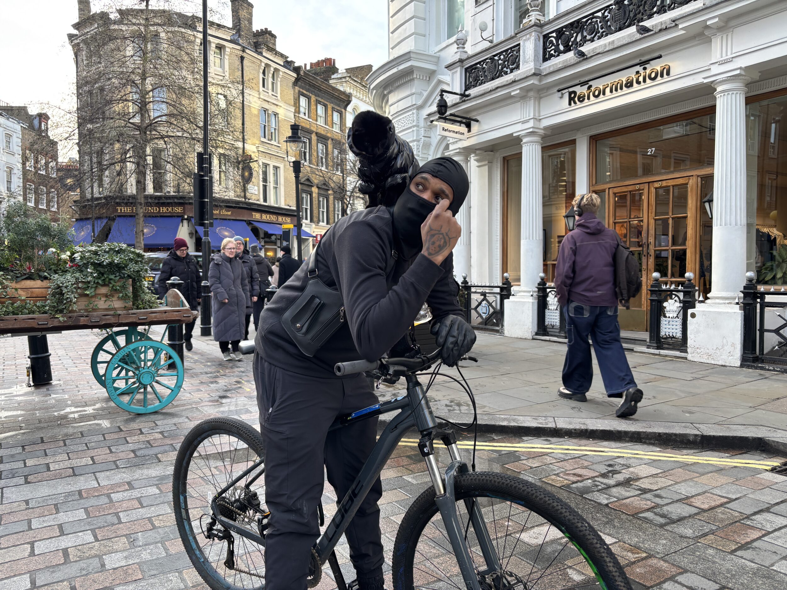 Mac is an internet personality, recognisable from signature black balclava look, who cycles across London, with his cat, Matteo, perched on his shoulder. Their aim is to make ‘the city smile again’, with their content focusing on this positive message and their close dynamic.