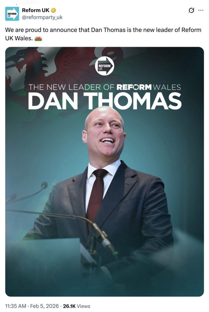 HeadlineFormer London councillor announced as leader of Reform UK in Wales