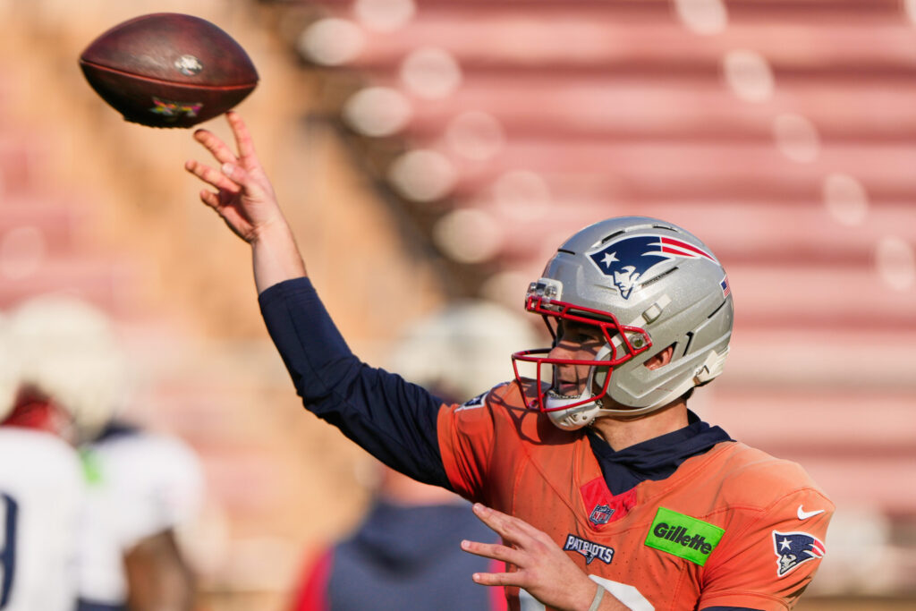 New England Patriots quarterback Drake Maye passes during practice ahead of the Super Bowl 60 NFL football game against the Seattle Seahawks, Wednesday, Feb. 4, 2026, in Stanford, Calif. (AP Photo/Charlie Riedel)