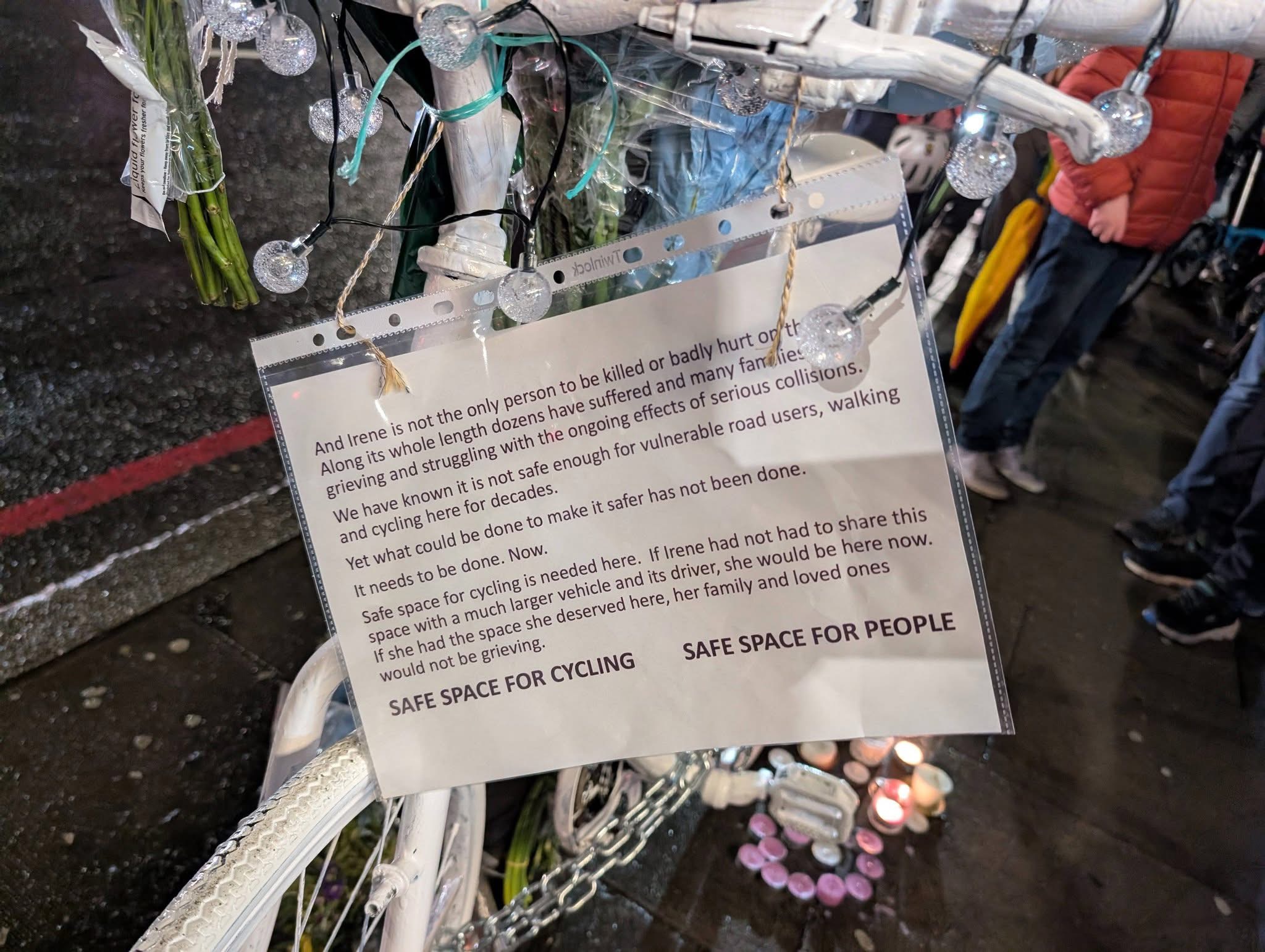 On Friday night, friends and residents held a vigil for Irene Leardini, an experienced cyclist and bike mechanic, who died following the collision between her bicycle and a lorry. Those at the gathering paid tribute and said they wanted to draw attention to what they describe as persistent safety issues on the route.