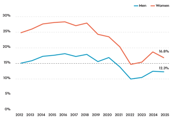 Figure: Proportion of jobs below the real Living Wage by gender, 2012-2025. [Source: London Living Foundation]