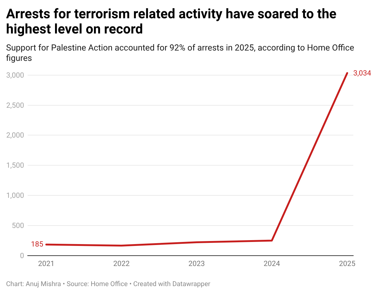 Terror arrests have surged to their highest level on record, according to new Home Office figures. 3,034 terror arrests were made in 2025, more than 11 times the number in 2024.