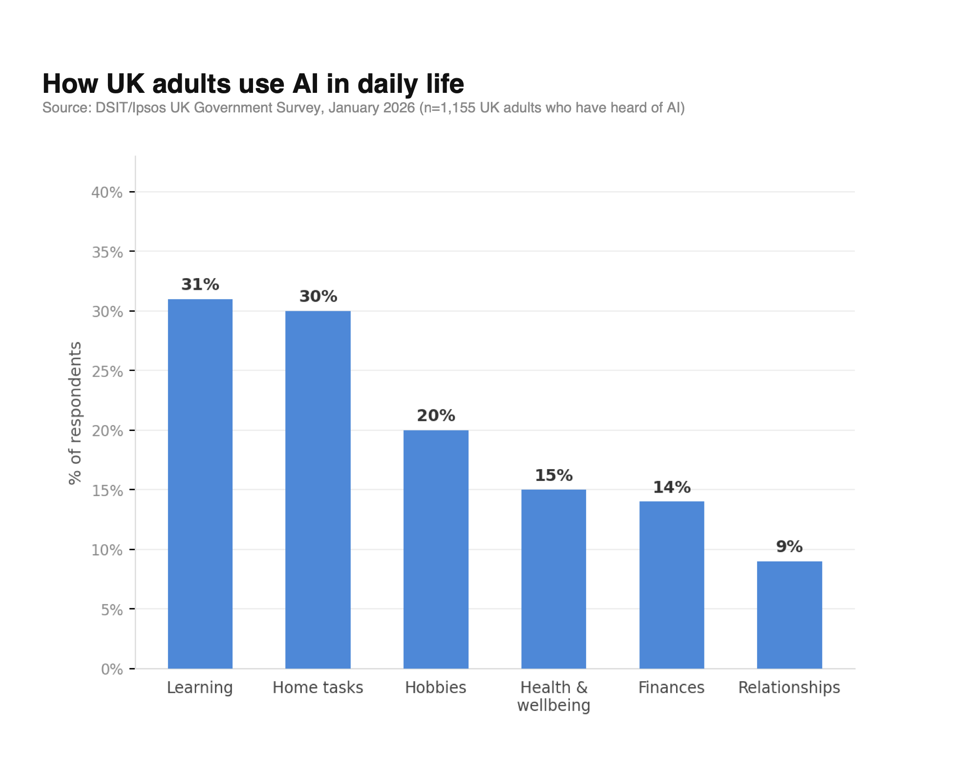 How UK adults use AI in daily life. Credit: DSIT/Ipsos UK Government Survey, January 2026