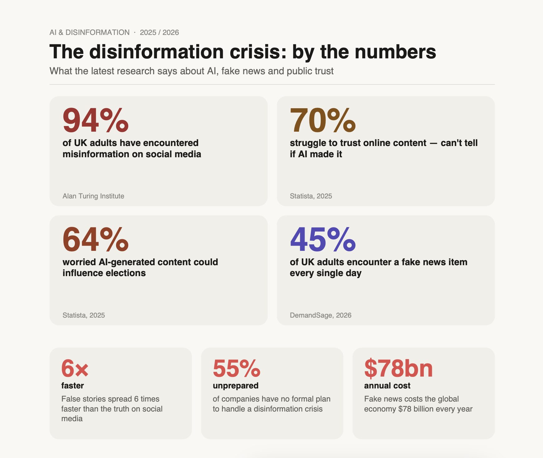 Credit: Data from the Alan Turing Institute, Statista Global Survey (2025), DemandSage (2026) and Signal AI (2026). Figures reflect UK and global research into public exposure to misinformation.
