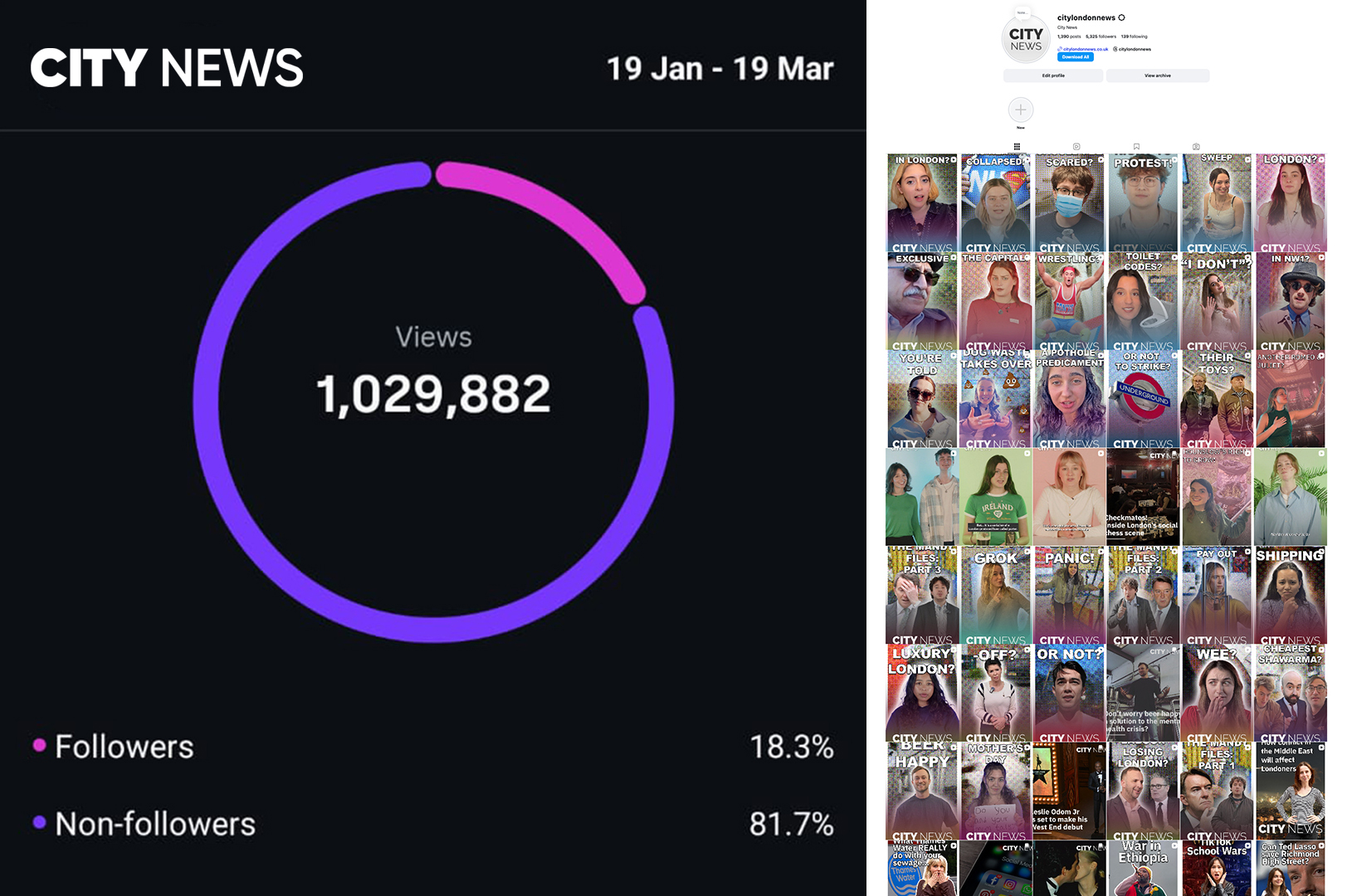This term alone, the City News Instagram account passed 1 million content views. Between January 19 and March 19, our content reached 417,836 accounts, up 254% on the previous period. 81.7% of views came from non-followers, driven by discovery, while reels proved the most popular format, attracting 86.4% of views.